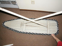 I did it! And it was easier than I thought. I used some tips from here and here. I did not make a new liner, as I did not have the materials on hand and the old one was OK for now. So, I pulled out some black fabric with white flowers on it- I got 6 yards of this for free at the thrift shop a while back, and it is 60" wide fabric too, so there is a LOT of it. I think the black will keep the board from looking dirty too.